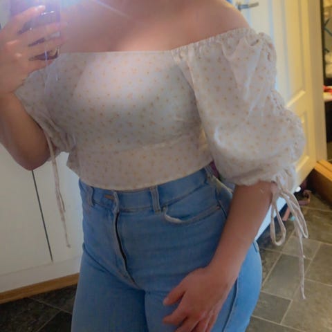 Selger gul topp med rødet og lilla blomster fra Cubus. Størrelsen er S. Toppen har V-hals foran. Toppen er bare brukt én eller to ganger.