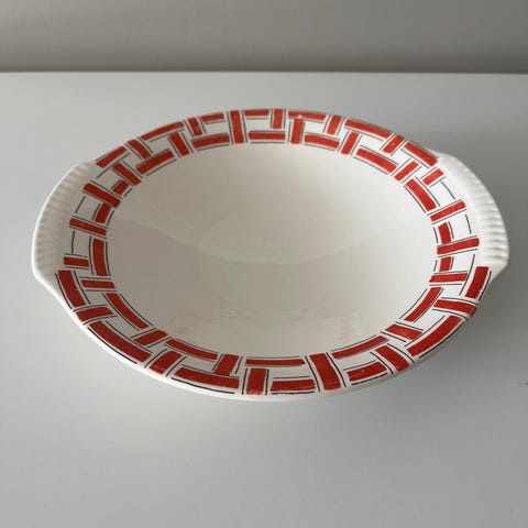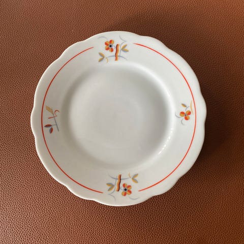 En vakker asjett fra Egersund med sjelden dekor i kremhvitt, burgunder-rødt og gull. Produsert i 1954 eller senere.