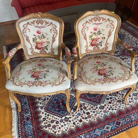 Rokokko stol, håndlaget i treverk. Slitt i stoffet ved armlener, rygg og sete. Gammel men fin og dekorativ møbel. God å sitte i. Kan trekkes om til et nytt møbel.