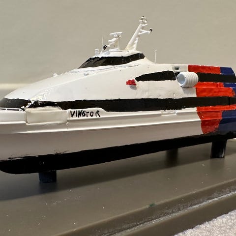 Romersk gallei fra Modelshipmasters. «Caesars Galley i tre. Kjøpt for 17 år siden i den tro at det var et fullstendig byggesett. Delvis samlet av leverandør, men fortsatt masse å gjøre selv. Har ligger i originalesken siden den gangen. Nå er det på tide at noe andre gjør den ferdig. Alle deler følger med. Fremstår nøyaktig som levert. Ny pris i dag er 1900$ (20 000kr) ferdig samlet. Pris kan diskuteres.