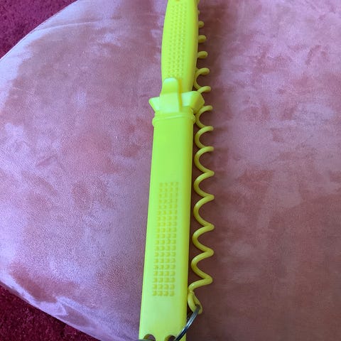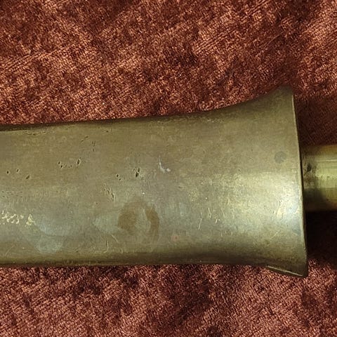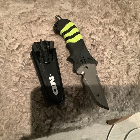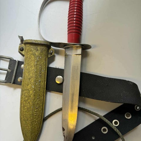 Kniven er gammel, muligens antikk. Har vært brukt som utstilling i butikk som blant annet drev med dykking siden 50 tallet. Viser ikke godt på bildet, men kniven har fintannet blad på ene siden og er ganske skarp selv etter alle disse årene. Kniven ser ikke ut til å være slipt. Kjenner ellers ikke noe til historien til kniven. Selges til høyest bydende, men ikke under Kr.4500
