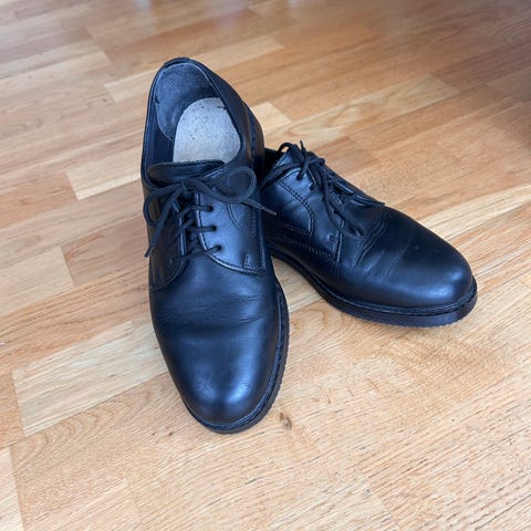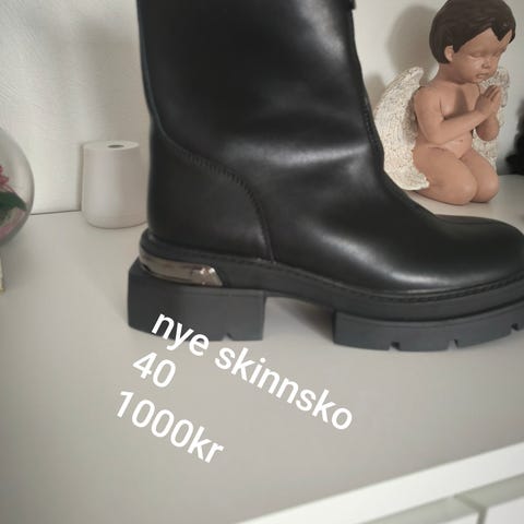 Har for salg noen megakule skinnsko med knyting i str. 40. Skoene har en spesielt formet liten hæl på ca. 4 cm. Passer til en person med bred fot, og kan brukes til både bukse og skjørt.Skoene er knapt brukt.