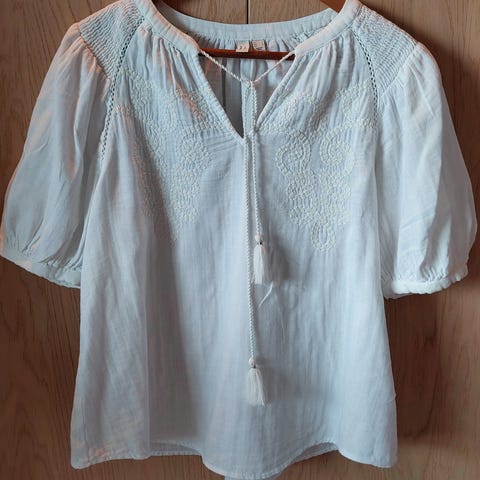 En lite og pent brukt hvit tunika I str 38. Fin hekling og biesesømmer i halsen. Med knapping i halsen og snøring under bysten . Knapp på ermene for å regulere lengden. Deilig tynt stoff.