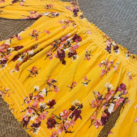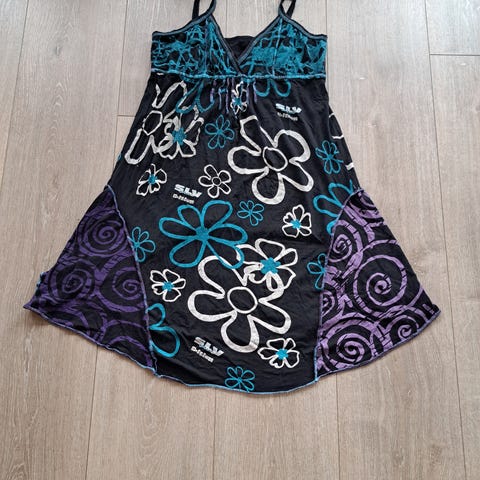 Gul og hvit ned kant i gul/hvit/sort, snøring i livet, korte ermer, romslig one-size