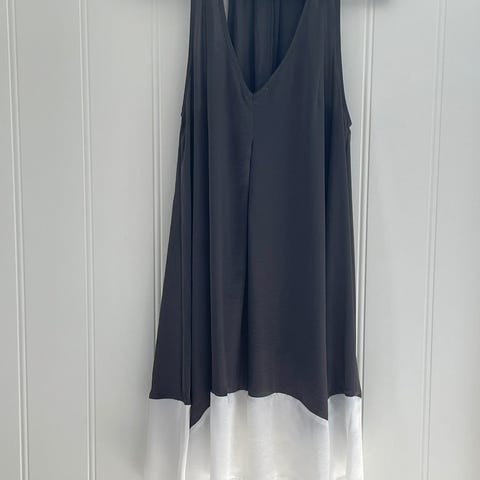 Sort florlett sommerkjole med hvi kant nederst.