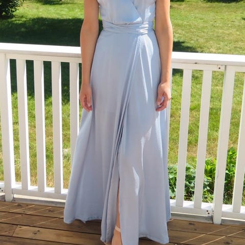 Kjolen har fine draperinger foran på brystet, silkebånd som markerer midjen, og et florlett skjørt. Lekre detaljer bak med silkebånd for å stramme inn kjolen. Enkel & elegant, og en superfin sommerfarge.