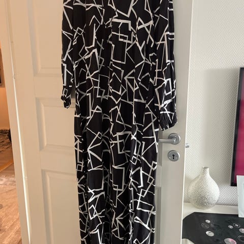Sebra-farget kappe med knyting i livet fra Malene Birger. Kostet rundt 7000 kr ny. Er ikke mye brukt. Den er såpass romslig at den passer til flere størrelser enn medium (som bare er sånn ca, det er vel egentlig en onesize).