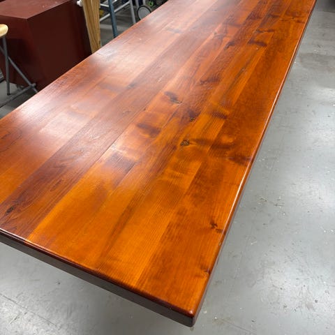 Oljet trebord med grålakkert understell i metall. Bordet er tungt og solid! Størrelsen tilsvarer dekking til ca 8 personer.