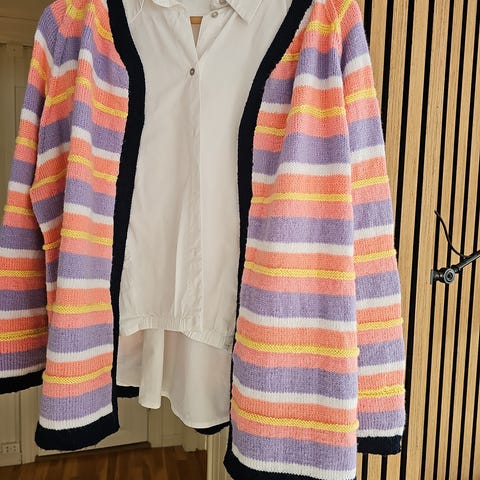 Nydelig strikket cardigan med lange ermer i myk kvalitet fra Carla F. Cardigan lukkes med en knappen foran. Brukt en gang, fremstår som ny. Ren, ingen flekker eller skader.