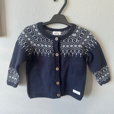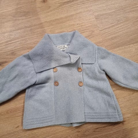 Godt brukt søt strikket lysegrå cardigan fra Newbie i str. 74 med treknapper. Brukt av 2 jenter, men passer også fint til gutt. Den er i 100% bomull. Lukkes med 4 treknapper fremme på brystet og er åpen nedover langs magen. Veldig søt. Jeg kan ikke se noen flekker, men det kan være den er litt falmet i fargen noen steder 😊