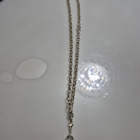Bergkrystall pendel. Måler 47cm fra ende til ende.