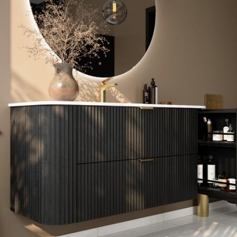 Denne kolleksjonen, skapt i et moderne og stilfullt design, skiller seg ut med trendy, ribbede fronter laget av høykvalitets MDF. Møbelkroppen i laminert plate garanterer holdbarhet og motstandsdyktighet mot baderomsforhold.