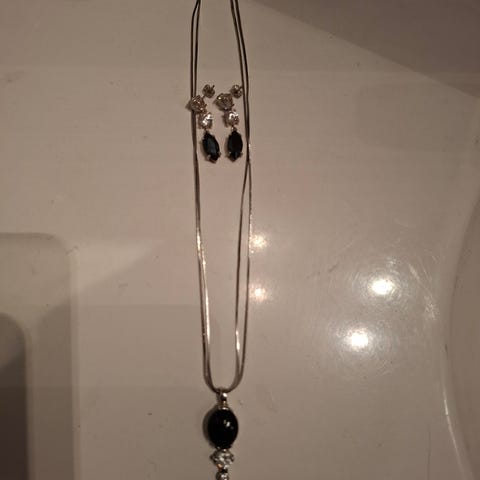 Selger her smykker, sølvfargede med svarte stener, for kr 200,-. Kjedet er nytt og stemplet 925, 44cm, men på de to anheng og øredobber finner jeg ikke stempler. Dog er disse svært pene, og jeg har ikke funnet bruksslitasje, men dog, altså brukt, så noe slitasje må kanskje regnes med. Jeg har valgt typen sølvkjede fordi det er så pent til, synes jeg da.