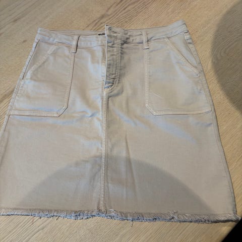 Beige skjørt i beige denim m/ strech. Ikke brukt. 1200,- nytt. Kule detaljer.