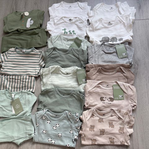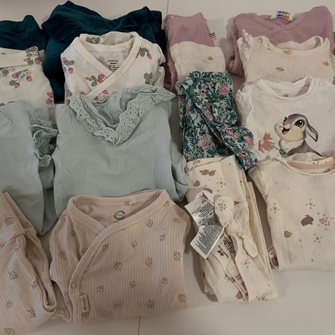5 bodyer i str 80 med korte armer. 4 fra HM og 1 fra Lindex. Den hvite og den rosa er litt slitt i knepping under samt har noen bruksmerker.