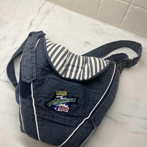 Selger en vintage bæresele av god kvalitet videre av merket 'Snu gli'. Stor lomme med glidelås bak. Justerbare stropper og klikk-feste ved hoften til den som bærer. Trolig kjøpt på 80 eller 90-tallet.