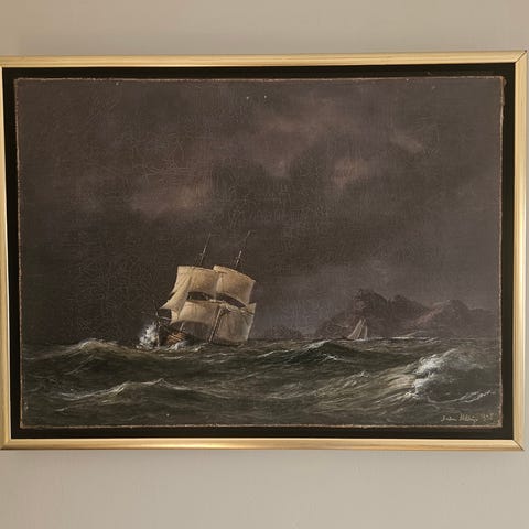 Selger pent oljemaleri av en seilskute mm-ramme følger med.