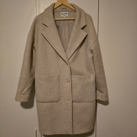 Så og si ubrukt stilig frakk. Det står XL inni, men jeg tror ikke den er så stor. Her er målene - overvidde 108 cm, hel lengde 88, lengde arm målt på undersiden 46 og overvidde arm 40 cm. Kan sendes.