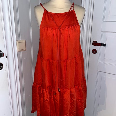 Selger en lite og pent brukt kort kjole / tunika fra SHEIN i str M / 38. Den er knall orange i fargen, er romslig i størrelsen og har underkjole. Stroppene kan knytes i den høyden man vil. Ytterdelen har pent hull-mønster med broderier. Se bilder for nærmere detaljer.