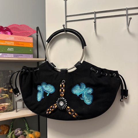 Veske i 100% bomull. Kjøpt i Paris. Lite brukt. Bredde 33 høyde 31. Mål på reim er 120 cm.