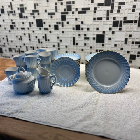 Vakre og klassiske servisedeler fra Sidsel blå, på Modell 400 «Morgedal». Formen er designet av Ragnar Grimsrud for Figgjo ca. 1954, med den elegante blå dekoren «Sidsel» av Rolf Frøyland.