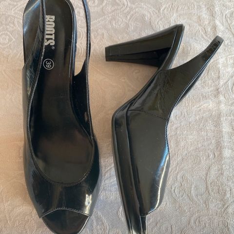Enzo Poli hæler str 39 1/2. Strikk i hælen. Sateng utenpå, skinn inni.