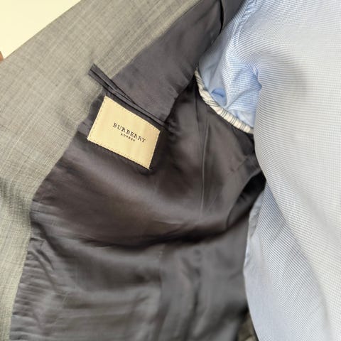 Selger dressen min i ull fra Burberry da den ikke brukes lenger. Dressen ser helt plettfri ut bortsett fra to små hull i buksen fra rens. Jeg hadde tenkt å fikse det selv ved å ta noe stoff fra opplegget og lappe, men har ikke fått gjort det. Dressen selges billig pga dette.