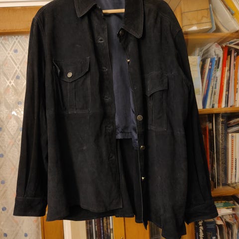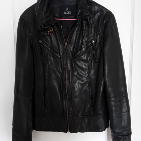 Selger lite brukt jakke i skinn. Sort med hvite detaljer. Størrelse 44-46.