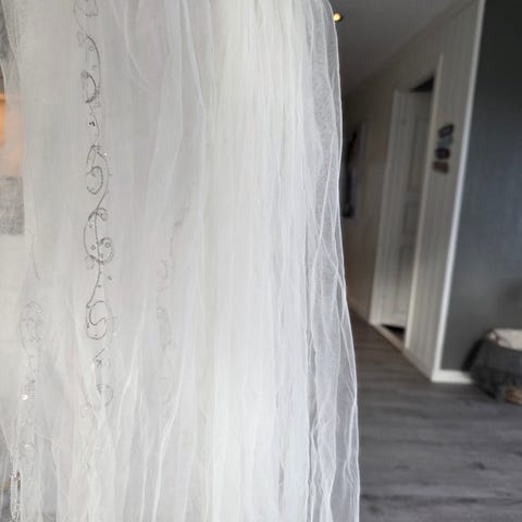 Selger nydelig langt brudeslør. Det er pyntet med strass. Brudesløret har en del som kan heves etter seremonien. Oppbevart i egen eske. Kommer fra røykfritt hjem. Kan sendes mot at kjøper betaler frakt.