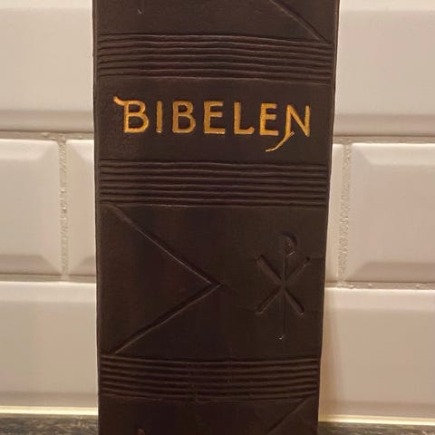 En Sort Skinn Bibel Med En masse kortt inne i, som er datert 1868 i Front av Etuiet og annen skrift trykket inn i skinnet.