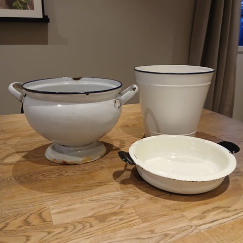 Et vakkert gammelt vaskeserviṣ i hvit med gullkanter. Stort fat og mugge+ såpeskål. Det er helt og og meget pent. Pris 1000/. evt. bud. Må hentes.