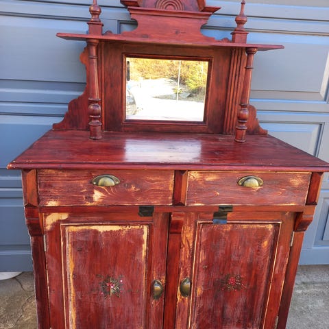 Dette er en orginal kannestol fra Telemark.Meget bra befatning.Hengsler er orginale.Har vært umalt.Så malt rød-diverse farger.Felter kan være dekorert .Sortmalt på ca1900t.Bokstaver og årstall er malt tidligere.