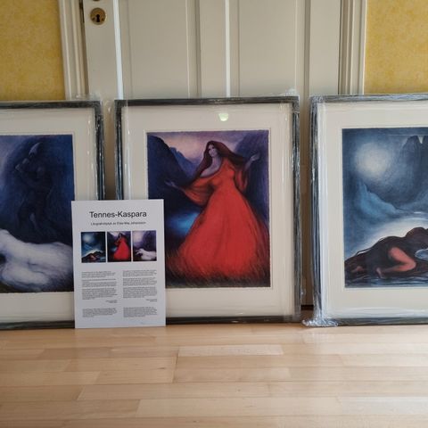 Det største (hvit ramme) er ca 65,5 cm x 82 cm (ytre mål.) Mener det var en lapp på baksiden da jeg kjøpte det, «Tre kvinner». Hvis man ser nøye etter, er det også tre kvinner som er fremstilt…