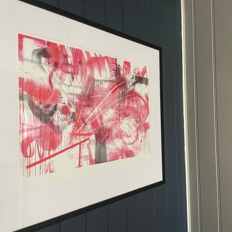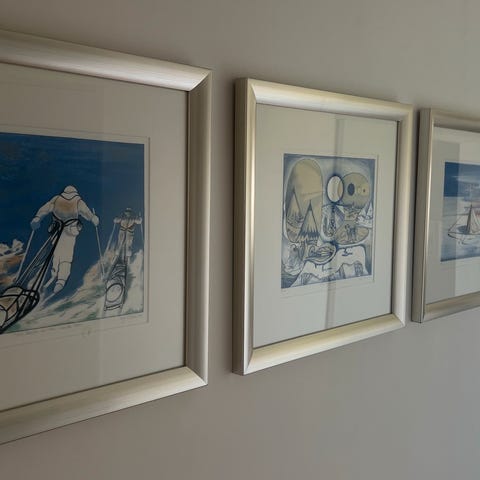 Det minste (mørk ramme) er er tegning fra 1985. Ytre mål er ca 53 cm x 62 cm.