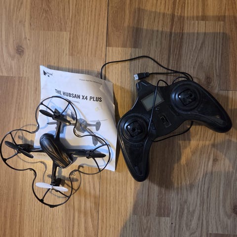 Selges med veske, fjernekontroller, 2 stk. propeller holder, ekstra baterri. laderr til 220 V strøm og til bil for sigaretttennuttak dvs 12 V.