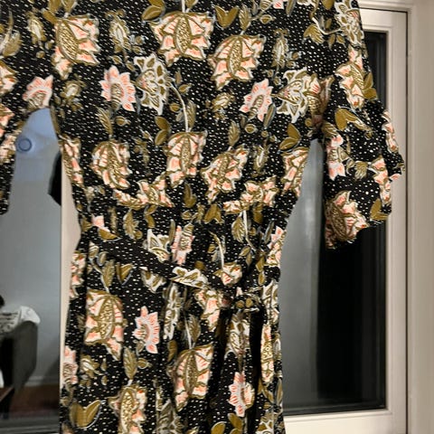 Materiale er trolig polyester, men det er ingen lapp i kjolen.
