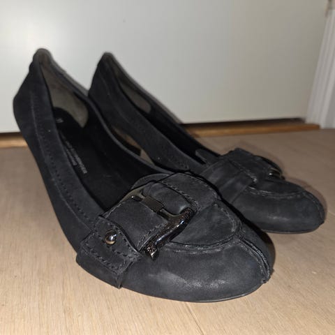 Sorte Italienske semsket pumps i skinn fra Gianrico Mori. Helhøyde 12,5 cm. Sålehøyde 1,5 cm. Jeg bruker til vanlig 43,5-44 i størelse, og disse passer meg godt. De er stor i størelse .