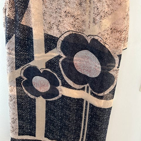 Oransje og hvitt med blomster. Florlett stoff. 155 cm langt, 32 cm bredt. Et lite hull som jeg mener ikke synes ved bruk. Kan være som det er eller kan lett sys. Lite brukt. Se bilder.
