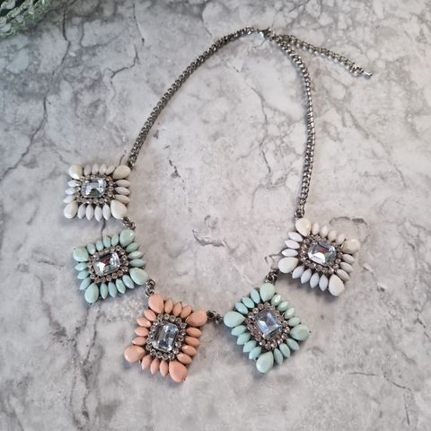 Smykke i sølvfarget metall med turkise "stener" som ligger veldig pent rundt halsen. I pen stand. Se bilder.