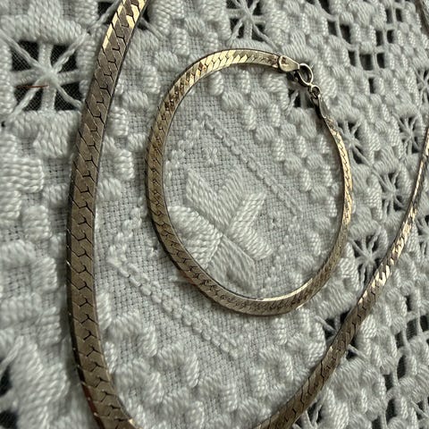 Sølvfarget sett, kjede/collier, armbånd og øredobber