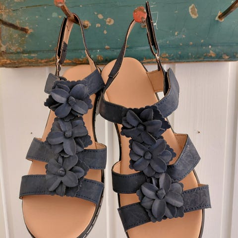 Sorte semskete platå sandaler med kil hæl fra Coach. Helhøyde 10,5 cm. Sålehøyde 3 cm. Har brukt dem inne et par ganger, de er god å gå med. Coach har god kvalitet. Har flere par sko/støvletter fra dem, de ligger høyt i pris på nette.