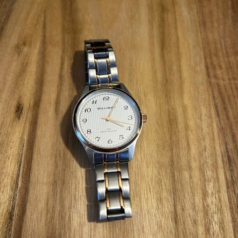 Fin kobberaktig farge på reimen og blått farge i selve uret.
