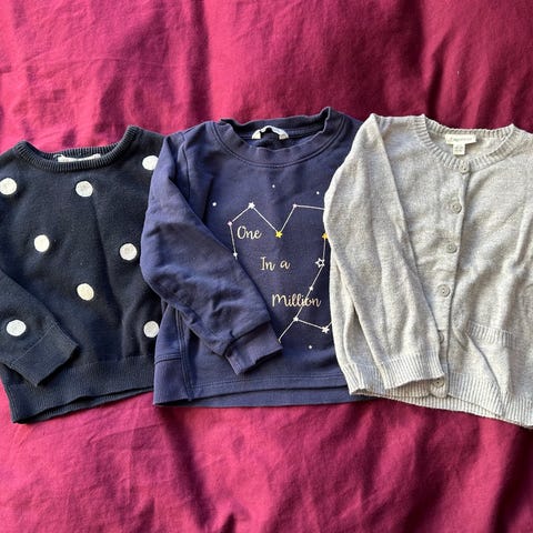Selger gensere i str.92. Selges enkeltvis, men tar også imot bud på klespakker.