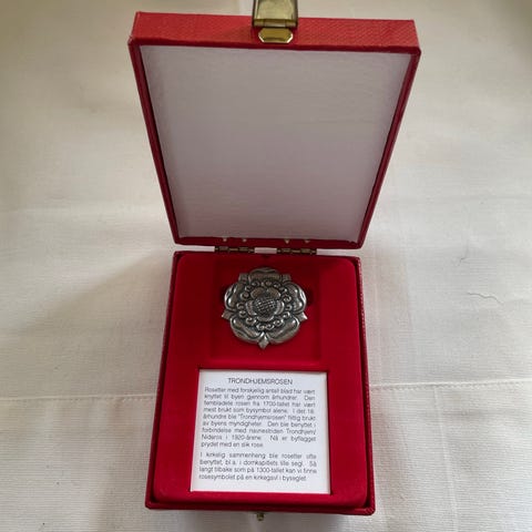 Selger en lite brukt Tronhjemsrosen i sølv 3 cm i diameter . Den er produsert hos Gullsmed Møller i Trondheim. Kan sendes mot at kjøper betaler porto eller hentes i Rygge. Se også gjerne mine andre annonser.