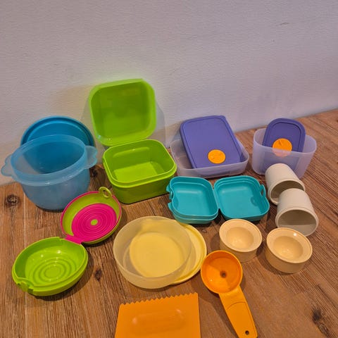 Selger også to brett for å fryse isbiter - ett i plast og ett i det jeg antar er silikon og to eggeholdere til kjøleskapet for kr 30, - per stk eller 100,- for alle fire.