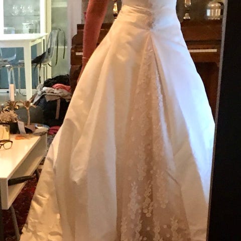 Utrolig fin brudekjole med påsydde armer. Denne kjolen er sydd ut under armene for å få plass til pupper. Dette kan selvfølgelig taes inn igjen😄. Kjolens nypris er 28 000 og brukte 9000 hos skredder. Kjolen skal til rens.