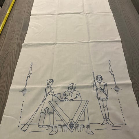 Det er et " kjøkkenhånkle" som er beregnet å henge på en tallerkenhylle, det er lettere å se når det legges dobbelt og legger det sånn som det ligger på det øverste bildet. Det er veldig gammelt 60++ år, Det er min farmor som har brodert det Kan sendes.