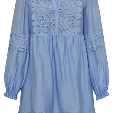 Vakker kjole fra Gossia med blomsterapplikasjon. Kjolen har knappåpning og lange ermer med strikkede mansjetter. Laget av 85% viskose og 15% polyamid. Vask forsiktig på 30 grader.