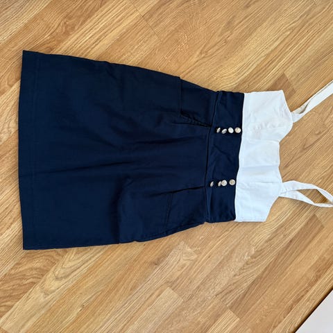 Hvit kjole med svart sløyfe, svarte stropper og gull farget knapper.