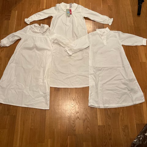 Kjolen passer 12 - 18 måneder. Datteren min var 13 måneder da hun brukte den, og er forholdsvis liten av vekst. Kjolen passet henne godt, men hun kunne fint brukt den når hun var eldre også.